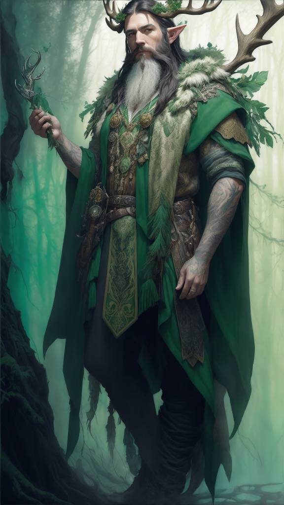 Hiram carries a tall oak staff covered in moss with a glowing stone atop in its knotted hold.