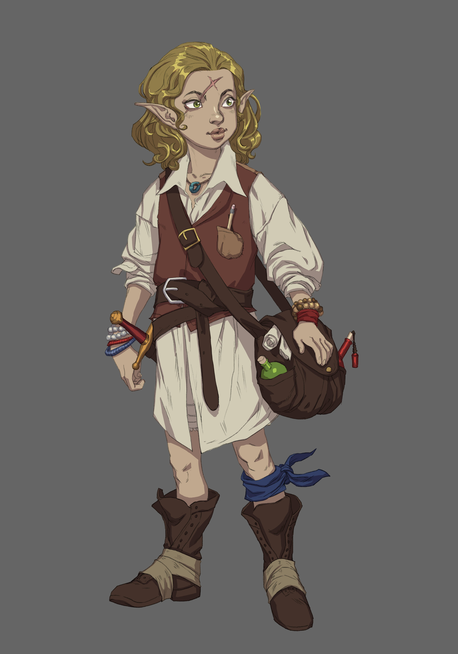 Jacqueline is a golden-haired half elf with light blue eyes and a large criss-crossed scar on her forehead.