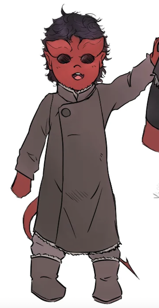 Kyra is a small, red tiefling girl with tiny red horns sprouting from her forehead and completely black eyes and hair.