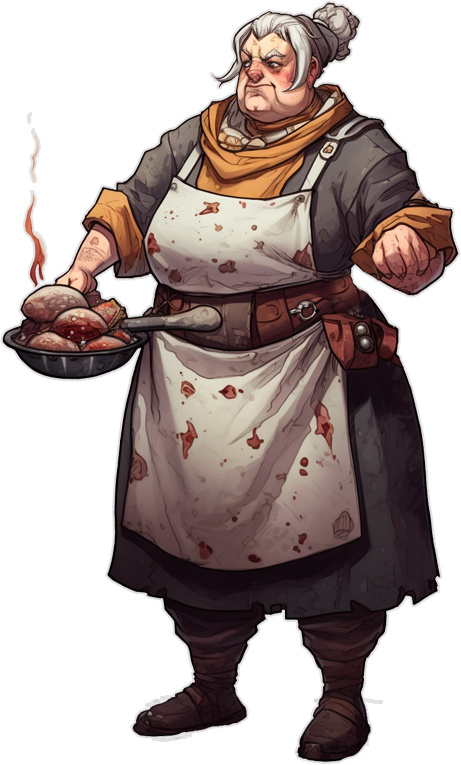 Olma owns and operates the Drunken Ox, the bar and inn used by travellers through Oxcross.