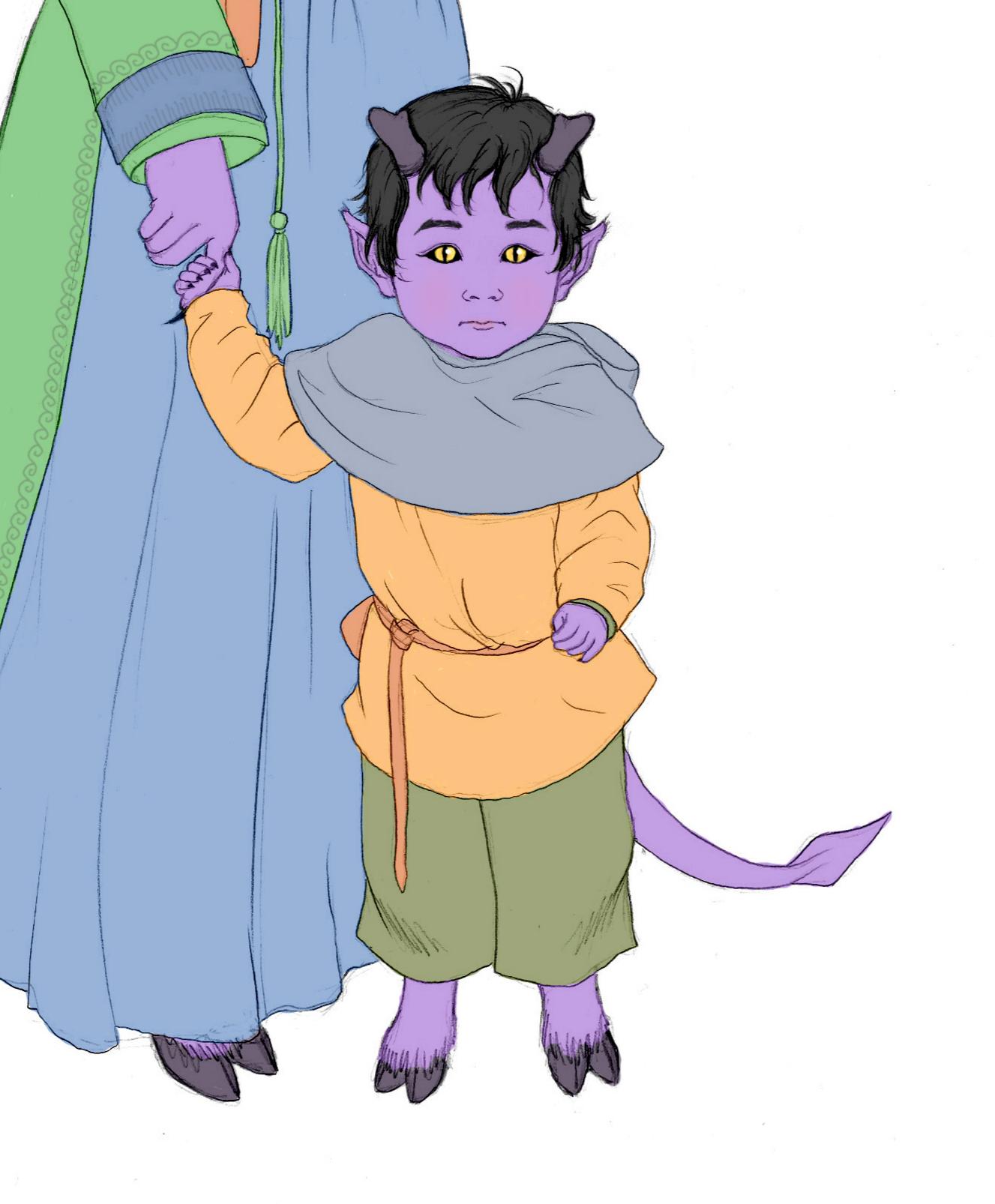 Theo is a light blue tiefling child of healthy size with light purple eyes and curling black horns.