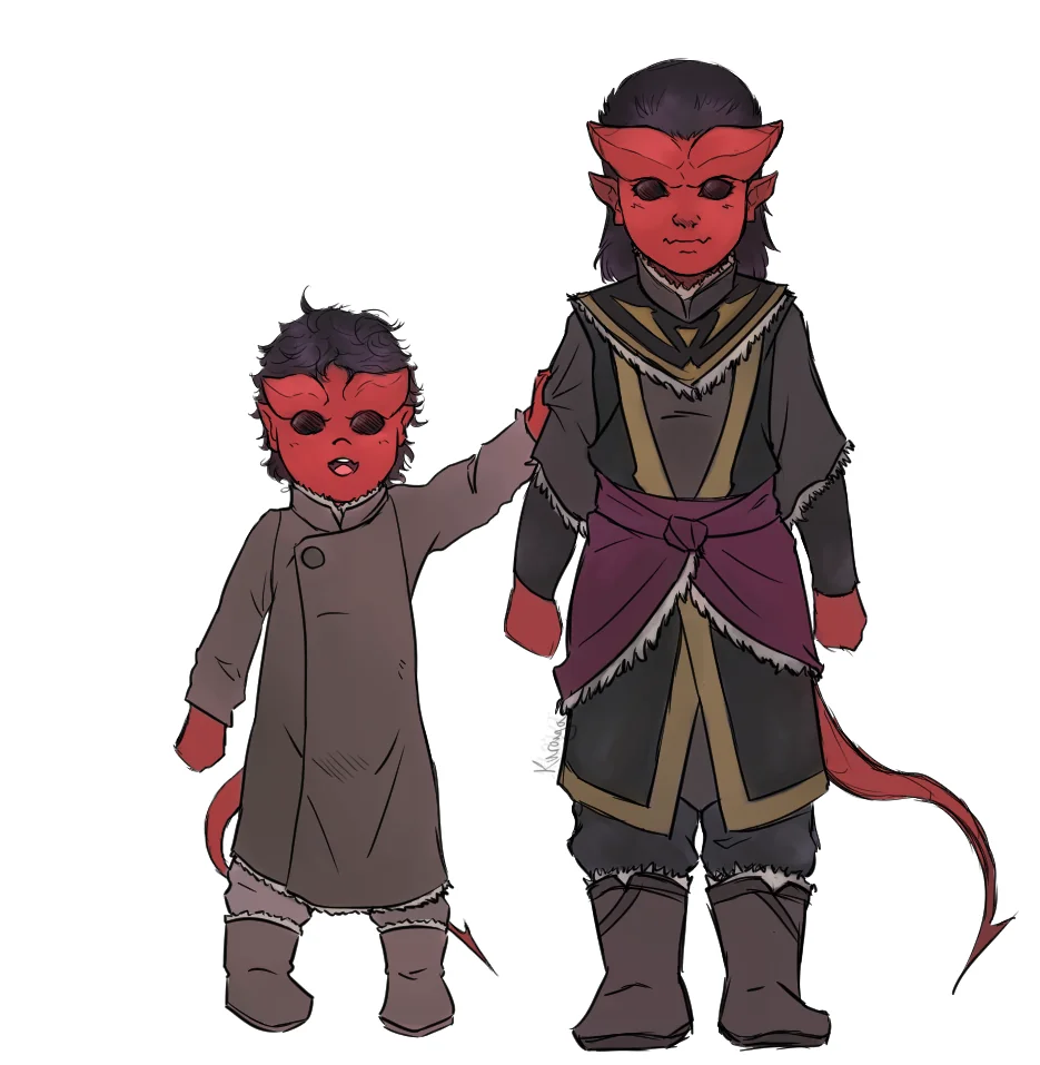 Valnas is a red tiefling boy with small red horns on his forehead, with completely black eyes and hair.