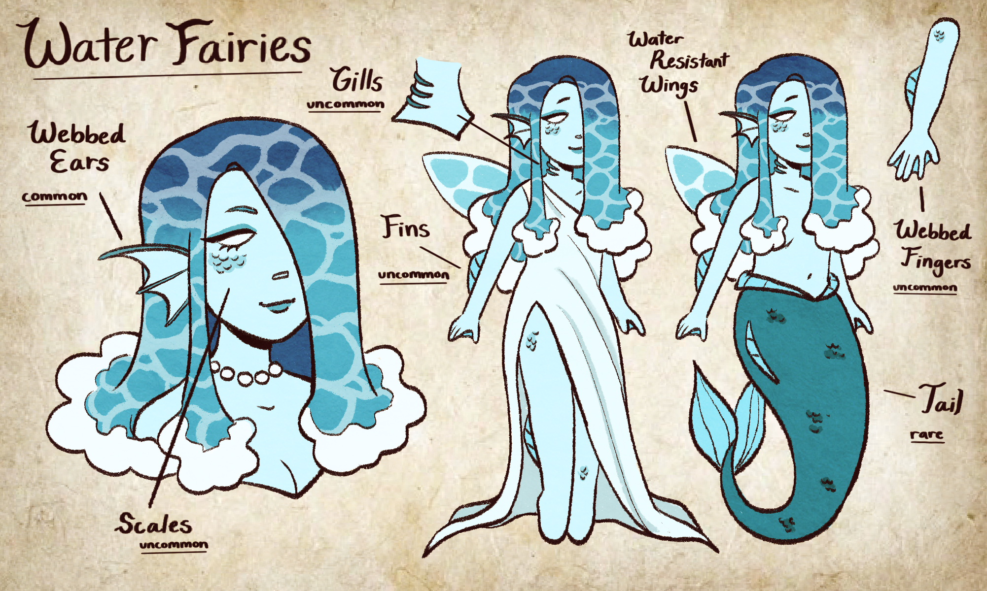 While you are free to be creative when making your characters, there are some traits that are often found within Water Fairies. These are not rules so much as guidelines. Take your pick!