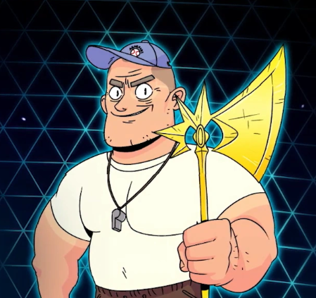 Daybreak is a human fighter who wears sweatpants and a baseball cap, and a whistle around his neck. He carries a giant spear glowing with holy light.