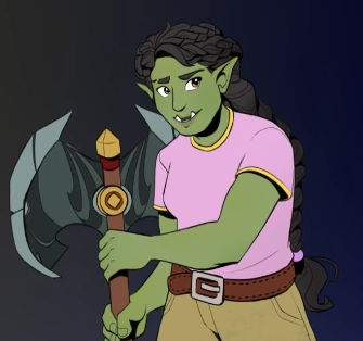 Katja is a tall half orc with olive green skin and long black hair that she keeps up in a braid. She has a round, broad face and pointed ears. There is a slit in her left eyebrow, green eyes, and two elongated canine teeth that poke out from her bottom jaw. Katja wears a pink shirt with yellow hems on the sleeves and collar. She wears an identical shirt underneath. On the bottom Katja is wearing tan riding pants and tall brown riding boots.