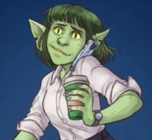 Sklonda is very much a classic goblin. She has green skin, yellow eyes, and big ears that come out the sides of her head. She has a classic "mom" haircut. As a detective, she wears a white shirt and dress shoes, and has an under-arm holster for her arquebus. She also wears her badge hanging off her belt. She is a very intelligent, hard-working, and determined individual, all traits that she (almost regrettably) passed down to her son, Riz. She tries her best to take care of her son and steer him away from the dangers of investigative work, but since her husband died five years prior, she spends a lot of time working to support him, which inspires Riz to follow in her footsteps.