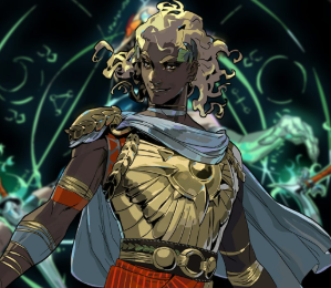 Son of Zarael. Apollo is a polite and confident god. He is also somewhat egocentric, boasting about his numerous formidable talents, claiming that all members of his family are talented, but that "some are more blessed than others." Apollo appears as an attractive young man befitting his role as the god of light. He wears elegant, gleaming golden armor richly embossed with a stylized sun at the center of the chest. A light blue flowing cape and golden pauldrons patterned with laurel cover his shoulders. He sports gold earrings in his left ear and dons a triangular striped red garment with golden details, fastened by a brown leather belt and golden accessories, with a colorful patterned underskirt peeking out.