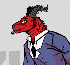 He is a hulking dragonborn. He's a red-scaled anthropomorphic dragon with a long tail and big claws. He has big horns that sweep off of his head. He wears a full grey suit with a blue tie.