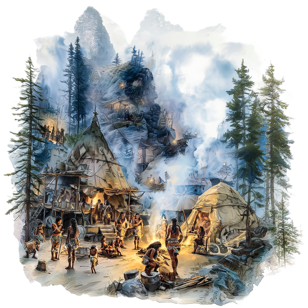 Their homes are lean shelters woven from hide and timber, open to the wind but warm with smoke. Furs hang to dry on wooden frames, catching the scent of sun and pine resin. The nights hum with distant thunder and the low growl of bears beyond the tree line.