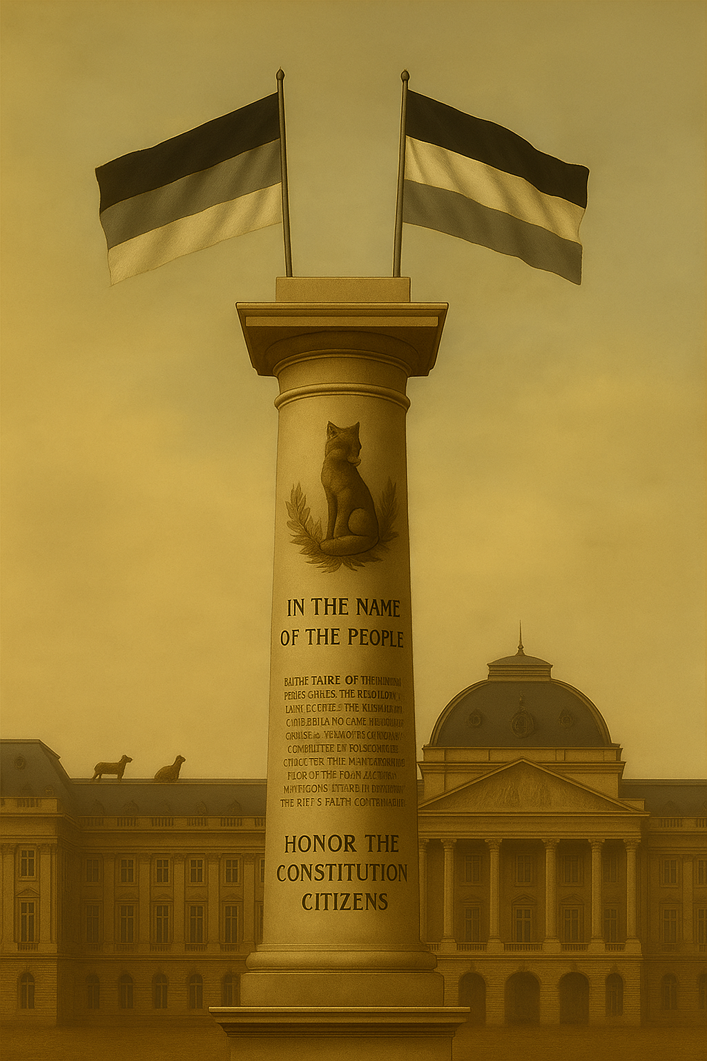 The Preamble Column and the Palace of the Reversed Throne on the Republic Square in Eustata. (Image by ChatGPT)