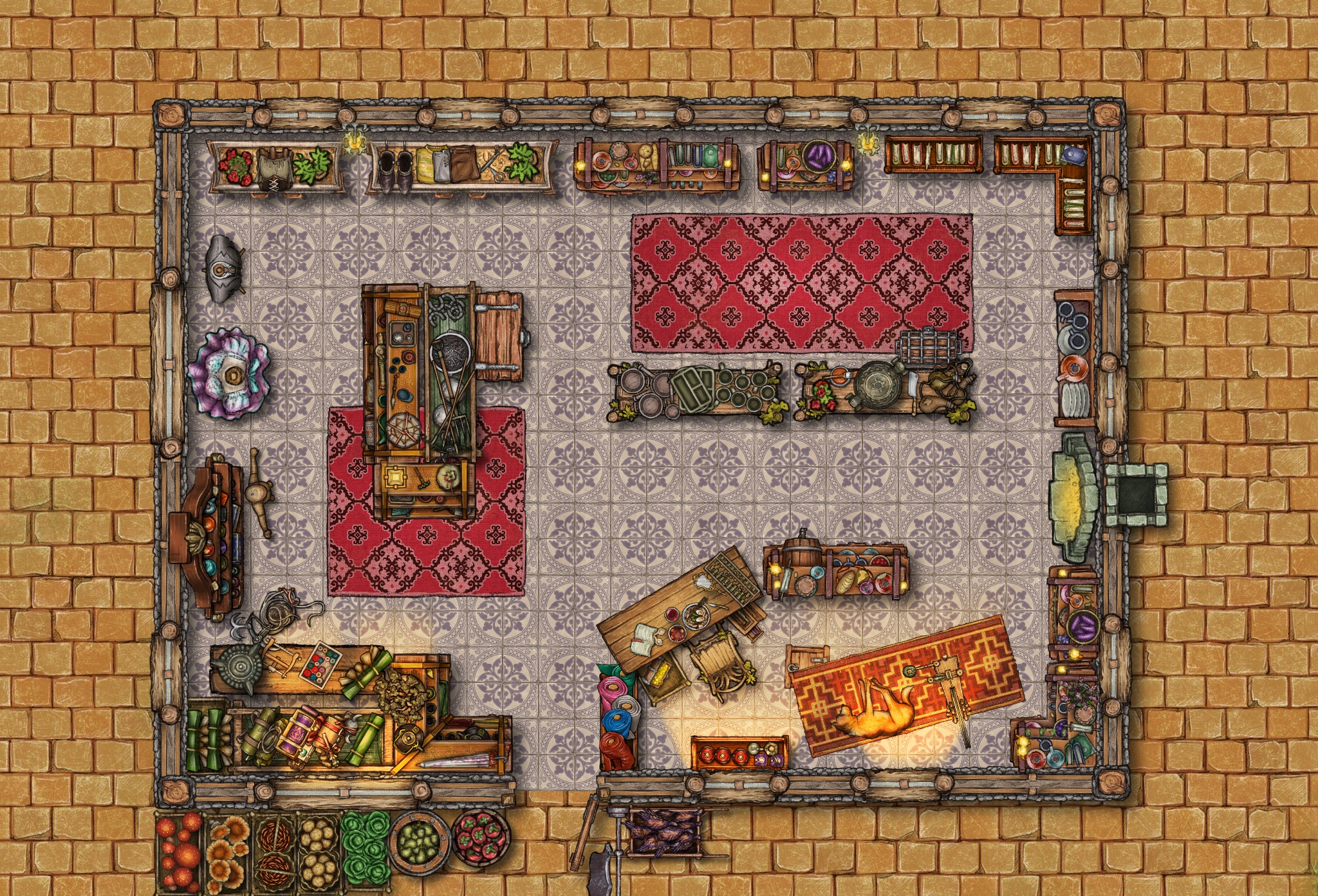 Shelves line the walls from floor to ceiling, brimming with everything from tools, dried foods, and lanterns to bolts of fabric and basic adventuring supplies.