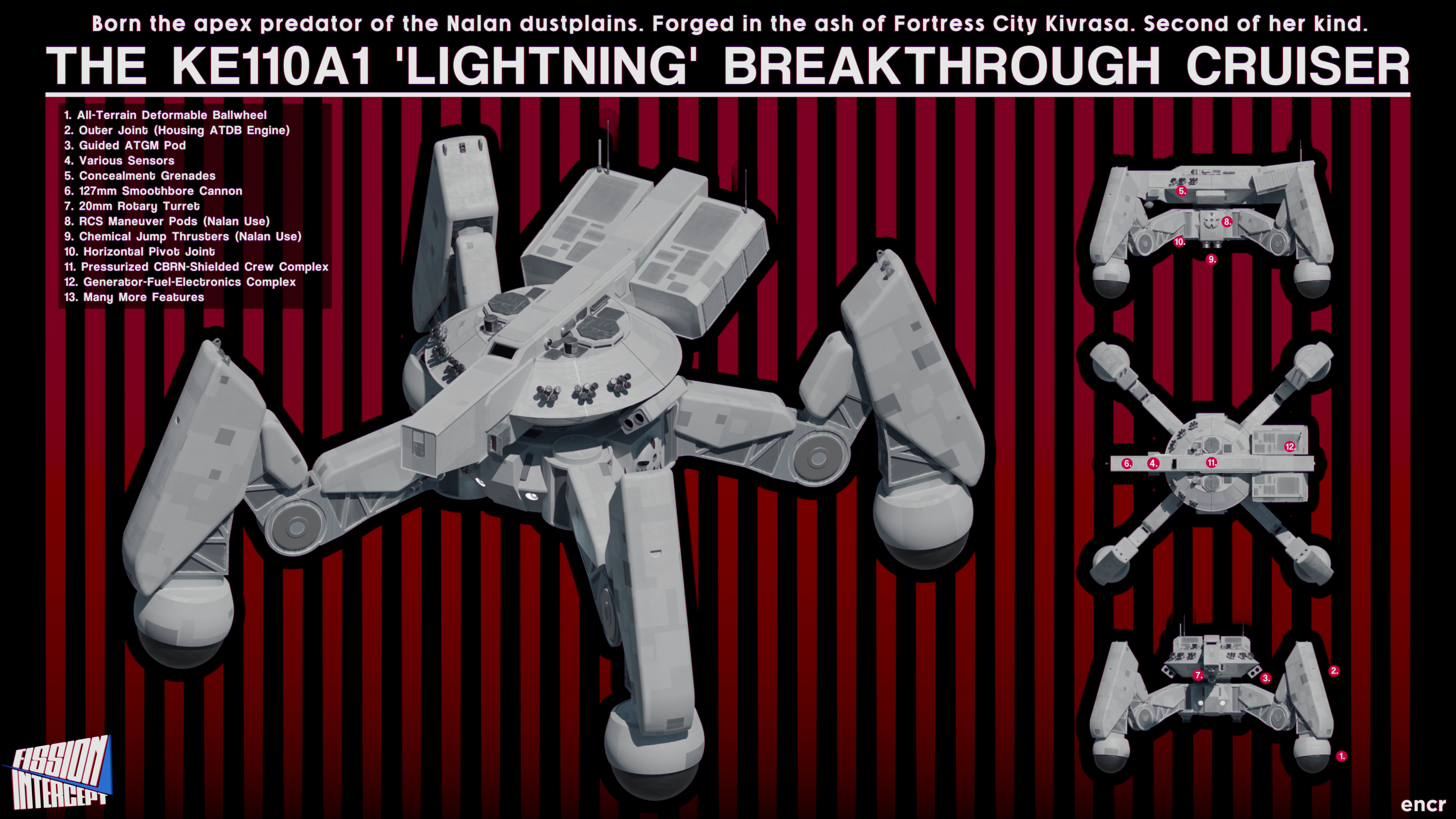 Born the apex predator of the Nalan dustplains. Forged in the ash of Fortress City Kivrasa. Second of her kind. The KE110A1 Lightning Breakthrough Cruiser. Though originally designed to replace the feeble Nalan combat rovers, Anrayalle breakthrough cruisers found themselves thrust into urban combat to break the Kivrasan deadlock.