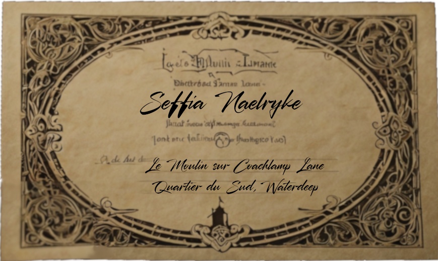 Pendant ce temps, Duroc récupère la rapière déconcertante et d'excellente facture de Vevette et trouve sur elle une carte de visite d'une certaine Seffia Naelryke, pendant que Nym pille les affaires du barman où elle trouve une superbe dague, une potion de Bouclier de la Foi +4, 4 fioles de venin de scorpion géant, un petit oeuf en céramique (30 PO) et un set d'outils de cambrioleur de maître (bonus de circonstance Sabotage +2, 100 PO)