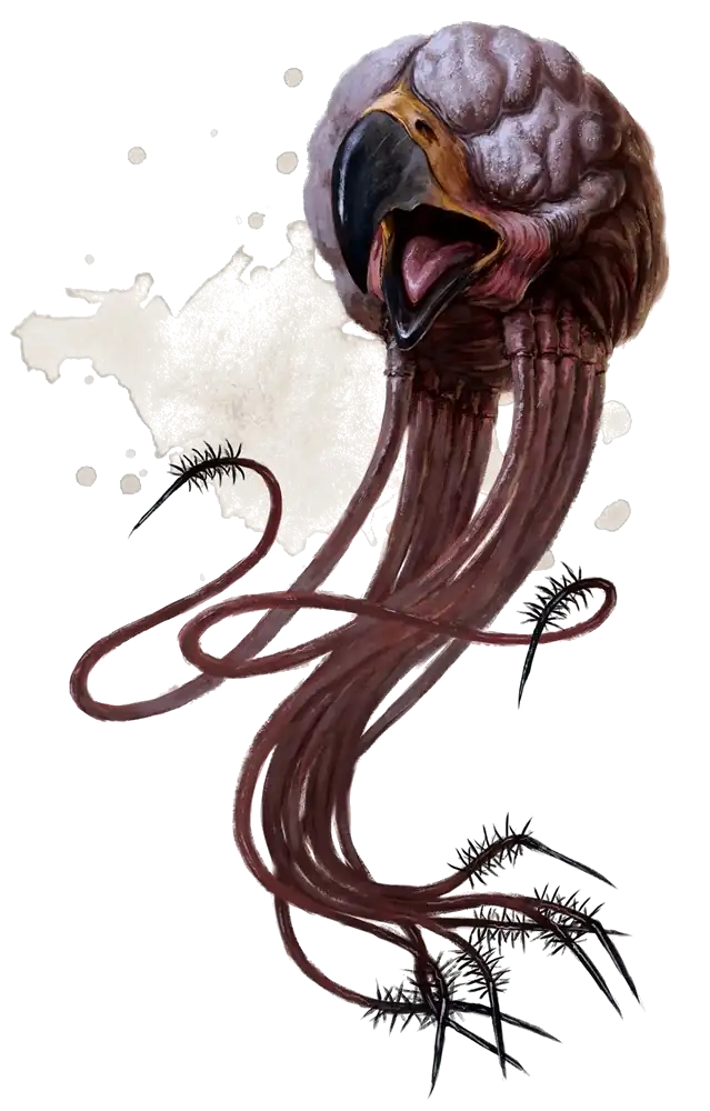C'est alors que 2 duergar arrivent et se joignent au combat. Alors que le combat se déroule, Meloon apparaît, accompagné d'une créature étrange flottant dans l'air. Celle-ci parle par télépathie à tout son environnement un charabia incompréhensible empreint de folie. Elle lance une décharge mentale qui étourdit Roane qui laisse tomber son arme, mais les autres résistent. Meloon ordonne alors à la créature, en Commun des Profondeurs, d'aller extraire le cerveau de Roane, sans savoir que Duroc comprend ce qu'il dit.