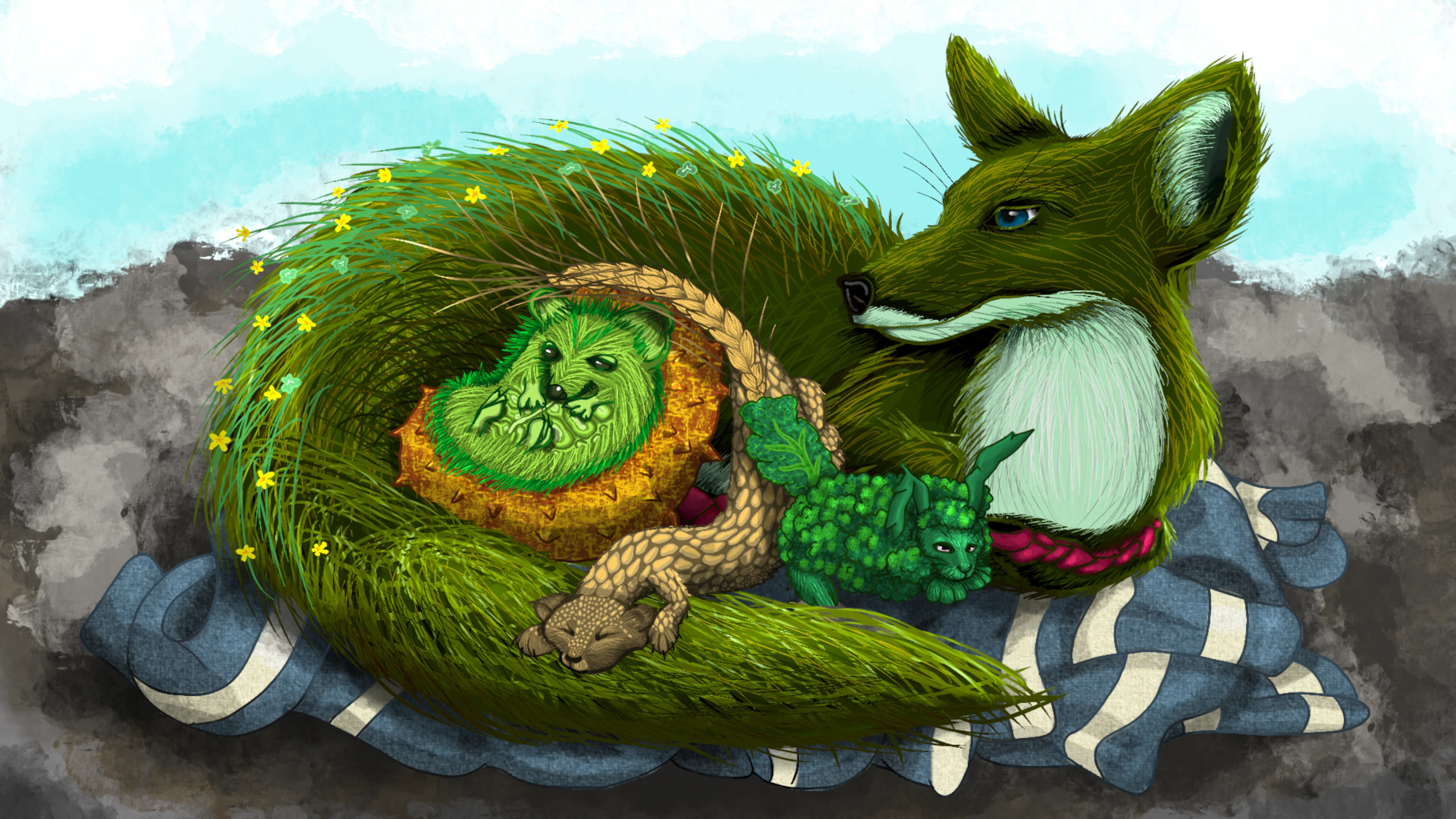While the Humans relaxed, the Florabeasts had their own little congregation. The Ourachs and the Sasquash walked around one of the least rocky spots, while the Lilytiger kept his nose to the ground, pawing here and there. The Foxalis stood by the smaller Wheatzel and the Broccoleap, while the Celereagle perched on the wagon, watching. Every so often, there would be a bark, a bray, or a growl. Saul stepped over a stone with his big ape feet, right as the Broccoleap let out a chirp. The Sasquash turned around, picked up the rock and tossed it into the grass.