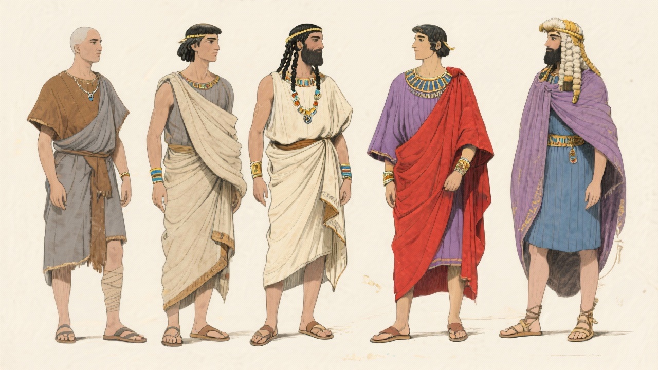 People wear tunics, robes, cloaks, and sandals . Jewellery matters because it shows status or religious importance. Hairstyles tell you about social rank straight away. You might see braids, shaved heads, or hair slicked with oil. In places like ancient Egypt, wigs and hair extensions mark out the wealthy. They also help with rituals and keep heads cooler in hot weather.