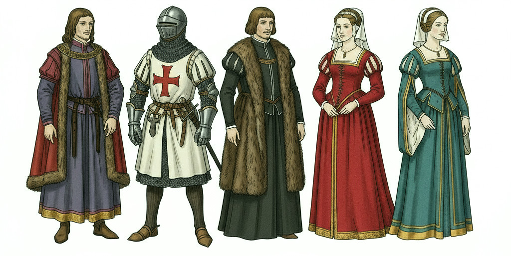 Clothing gets more fitted as tailoring improves. Wool stays popular, but you'll also see linen and early silk appearing. People wear tunics, doublets, hose, gowns, and cloaks. Simple armour pieces start showing up too.