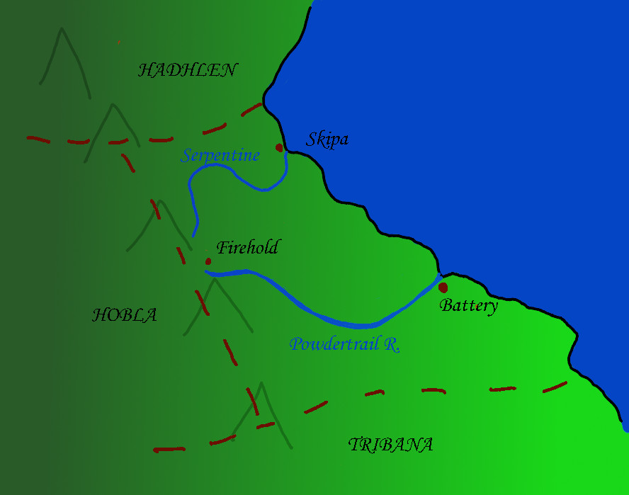 The Isha-Rak still rules from Firehold, a mountain factory-city noted for its production of smokepowder, explosives and firearms. Regular shipments up and down the Powdertrail River to the port of Battery control the only external market in firearms. To the north, the shipyards of Skipa sits at the mouth of the winding Serpentine. Since the failure of the Horde broke the covenant with the Child, the Isha-Rak has been bound from coronation to a god known as the Mother of Rivers.