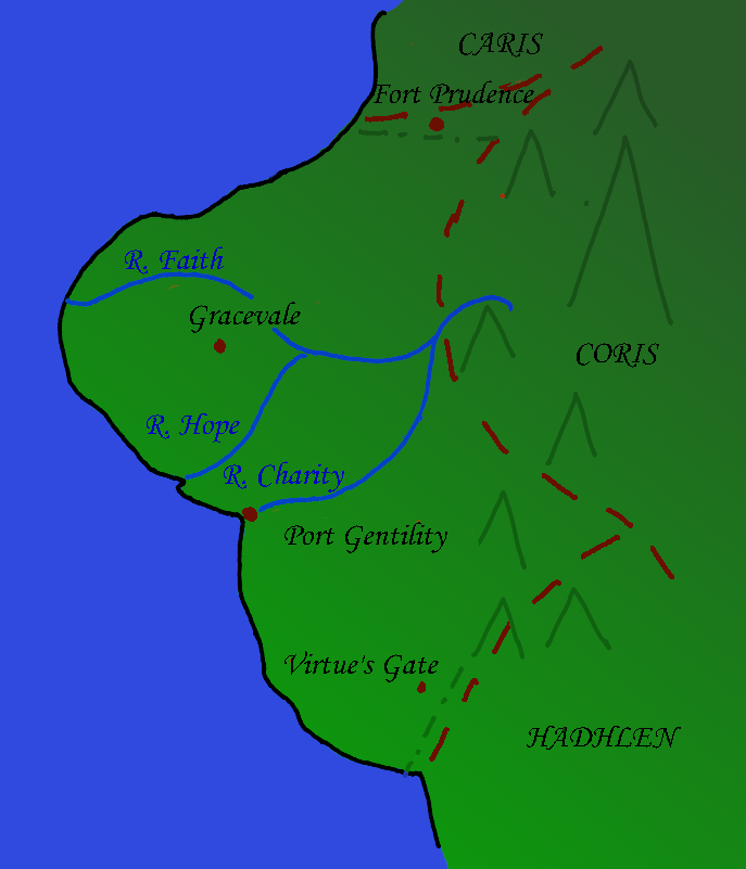 Tiefa is an isolated region, protected by the mountains in the east, a hazardous coast to the west, and two great walls of faultless draconic masonry. The northern wall is concealed by the vegetation until it looms suddenly out of the trees to bar all entry. It is watched over by troops from the garrison city of Fort Prudence,and access to Tiefa via the north wall gate is forbidden to all except agents of the state. A sprawling trade settlement stretches out below Fort Prudence, however, in which Tiefan merchants do business with outsiders, trading lumber, spices and medicinal plants. Visitors and newly arrived Tiefling refugees enter at the south wall, through the city of Virtue's Gate. This is as far as most go, and is home to Tiefa's embassies and diplomatic services. The only other route is thorugh the shoals and coastal defences to Port Gentility, the only deepwater harbour amidst the cliffs and maelstroms.