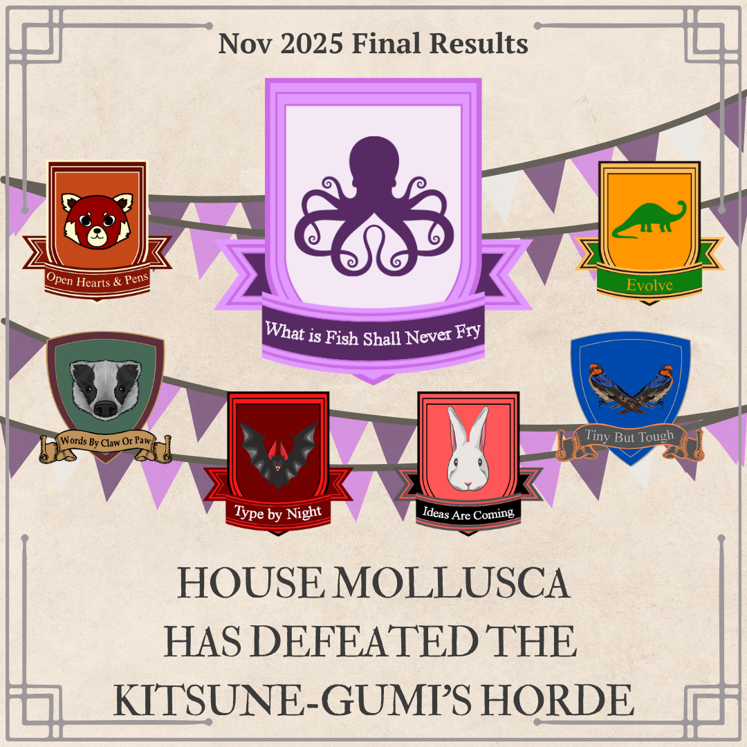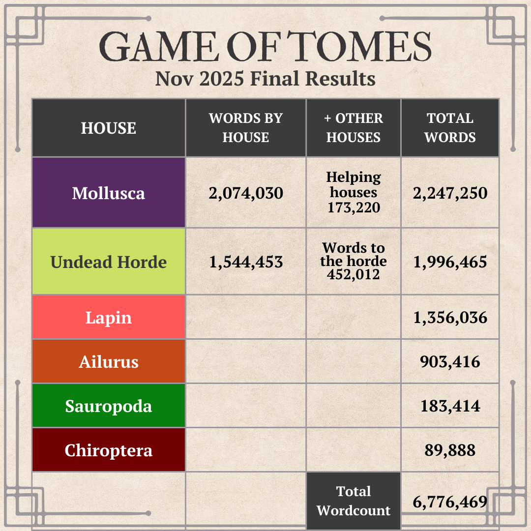 The Game of Tomes is a House based writing competition. We provide virtual write-ins with a competitive (but friendly) spirit.November is when the Game of Tomes Word Wars occur. They begin on the first of the month, and end on the last day of the month, in each participant's time zone. In this Word War, the "living" writers will vie against the Kitsune-gumi leading The Undead Horde.