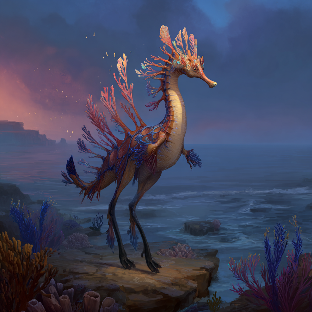 Lean and lithe, skuthari stand around 7 feet tall with a skeletal frame built for violent bursts of motion. Its hind legs are triple-jointed, its hooves split and ringed with spiked membranes for traction. Spine-plates along its back flare and flutter in response to sound and wind. The skull is long and sharp-faced—masklike, with seahorse curvature and flickering gill-fronds that do not breathe, but sense emotional shifts.
