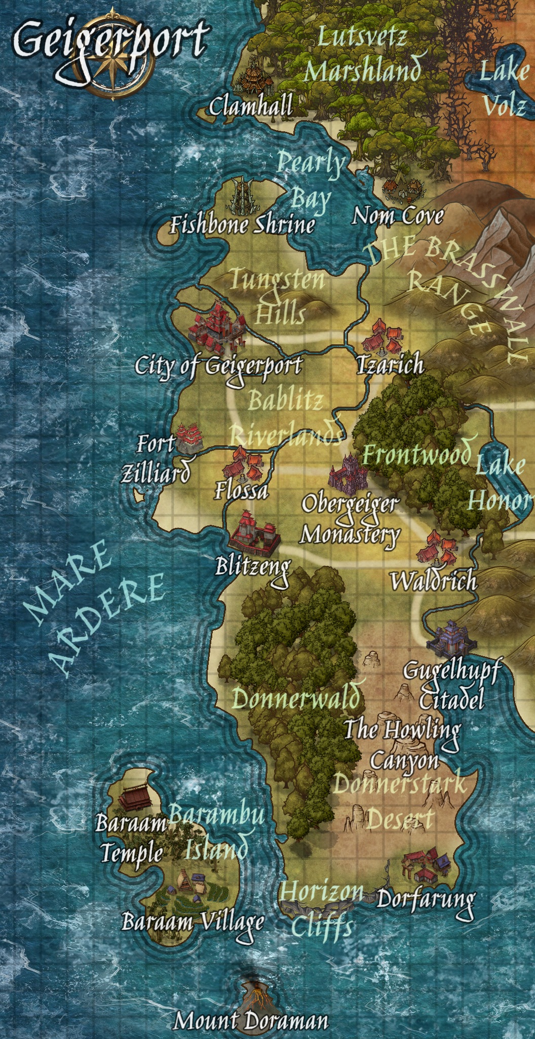 There is evidence that the region of Geigerport had a bustling naval society even during the Gilded Age, although few written records remain. In early history, the seafaring humans, the dwarves of the mountains and the wood elven tribes congregated on the riverlands and formed a nation that went by various names, such as Bablys and Gygar. This nation had trade with the underwater nations and the early settlers of the modern-day Freeisles. The leaders of this nation started to be called Sea-Kings for their influence over the surrounding sea. After The Fellstar struck the world, orcish refugees flooded the southern peninsula, which had been invaded by raiders of orcish descent earlier in history (which contradicts The Order's claims that orcs are humans, elves and dwarves mutated by the chaos unleashed by the meteor strike). The orcs established the magocracy of Khal Baraam to the south, where they worshipped the four Elemental Gods and harnessed the elements against their enemies. This prompted the Sea-Kings of Geigerport to form the Origo Fleet, a naval army like no other, which halted the advance of the orcish hordes. The fighting never stopped, however. During the Ashen Age, the people of Geigerport started to worship the northern sun goddess Politia Palladion as their main deity, as she was promised to break the persistent clouds of ash and bring warmth to people again. The Obergeiger Monastery was built in her name. A young girl whose skin and hair flared like the sun was brough there, for her appearance frightened her family. This peculiar girl grew up as a nun whose bold words lit the flame of faith in the hearts of those who heard her. She became a prophet of the goddess and gained the name of Saint Rahel. Her influence over the people was so great that it made the last Sea-King, Bertrand the Lesser, abdicate his throne and give it over to The Order. As years went by, The Order began to suppress all other faiths, including that of the orcs. This caused a great war to spread throughout Chronan, and the orcs and goblinoids of southern Geigerport were among the first to join the so-called "Forces of Chaos" that opposed the ruling religion. Even after the battle of Czenova which decimated the entire state and was said to end the war, the remainder of the orcish and goblinoid people kept pushing back, suffering greatly for it. It wasn't until High Shaman Zaroum Karsht of Khal Baraam declared a truce in the year 359 of the Steaming Age that the bloodshed ended. Khal Baraam was annexed into Geigerport, and all temples of the faith of the four Elemental Gods were abandoned or turned into those of the lawful gods. The goblinoids agreed to stay in the Donnerstark Desert to guard it in exchange for freedom. This was the cost of peace.