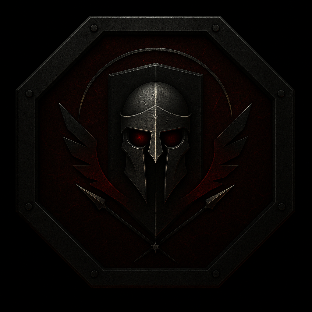 The Erebos Necrokrator, "Ruler of the Dead Darkness", is the Hellraisers made metal. The octagon is the Regiment's Covenant of containment: end what must end, spare what must live. The tower shield declares governability after impact, the city still standing when the smoke clears. At the same time, the skeletal helm is not a fetish of death but a warning delivered to war itself: your symbols will be taken and your memory turned to ash. Silver signifies restraint, the Tribunal line through every blast, while deep crimson remembers the price paid without glorifying it. The eight rim nails mark the timed beats of the Ashclock; each one a vow that fear will be used lawfully and never to mint martyrs. When this sigil faces a gate or glowers from a pauldron, foes understand that resistance will not merely be defeated, it will be unmade, and the world behind the Wall will wake to Order.