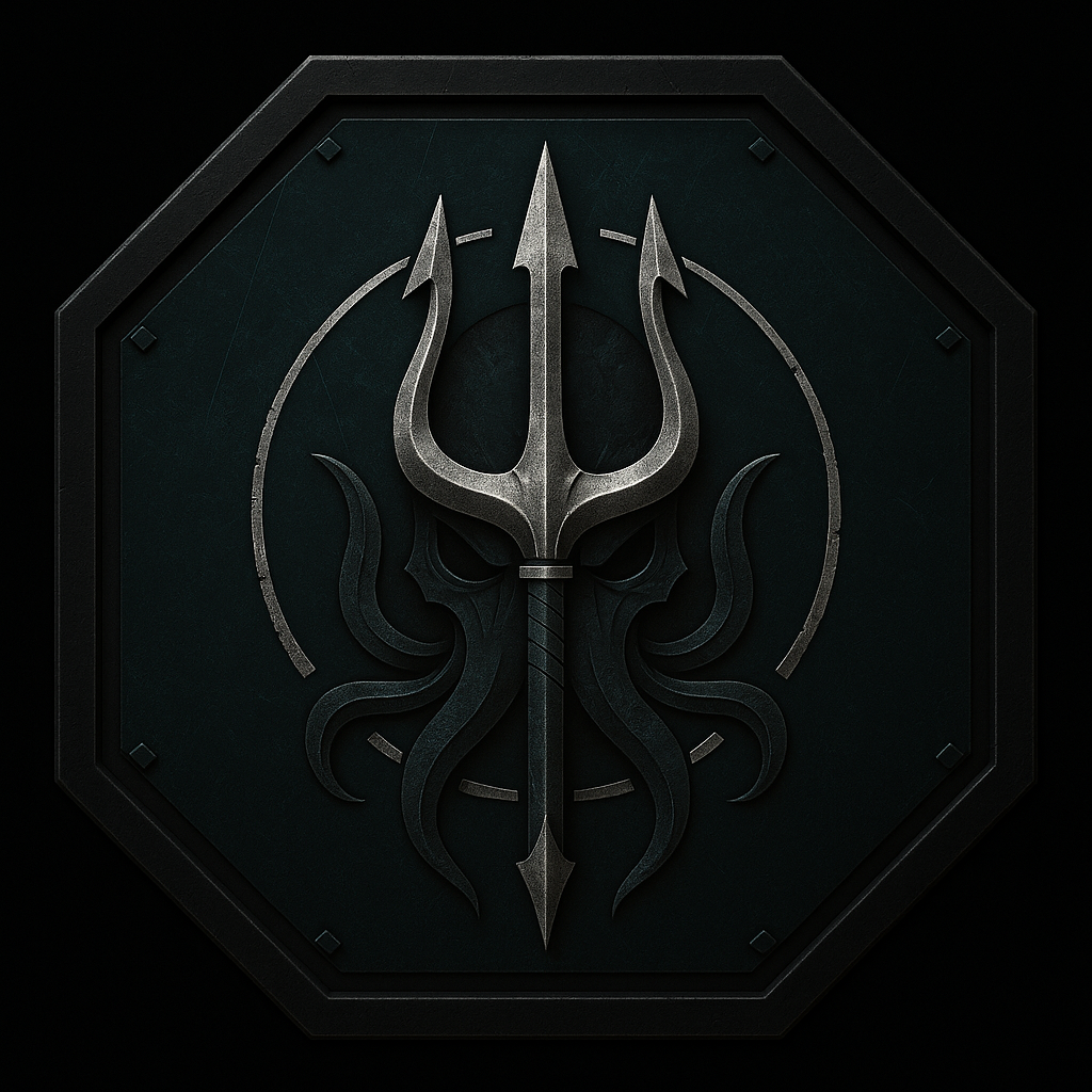 The Pontarch Leviathan is sovereignty of the deeps made metal: nature weaponized, restraint enthroned. The octagon is a lawful Order; the deep-teal field is the unseen theater, trench, storm, vacuum, where battles end before they begin. The trident declares the Tempests' threefold onset, command, power, mobility, cut in the same minute, while the kraken is patient dominion: the hand that closes from the dark and leaves no legend behind. Silver speaks to clean Law; black to silence; teal to the living systems kept breathing while the Enemy's will drowns. The eight rim cleats are the beats of the Waveclock; the broken halo vows that what the tines divide cannot rally. Where this sigil glints on hull or pauldron, dockmasters whisper and warships dim their lights, everyone knows the Tide has chosen a side, and the end will be sudden and inevitable.