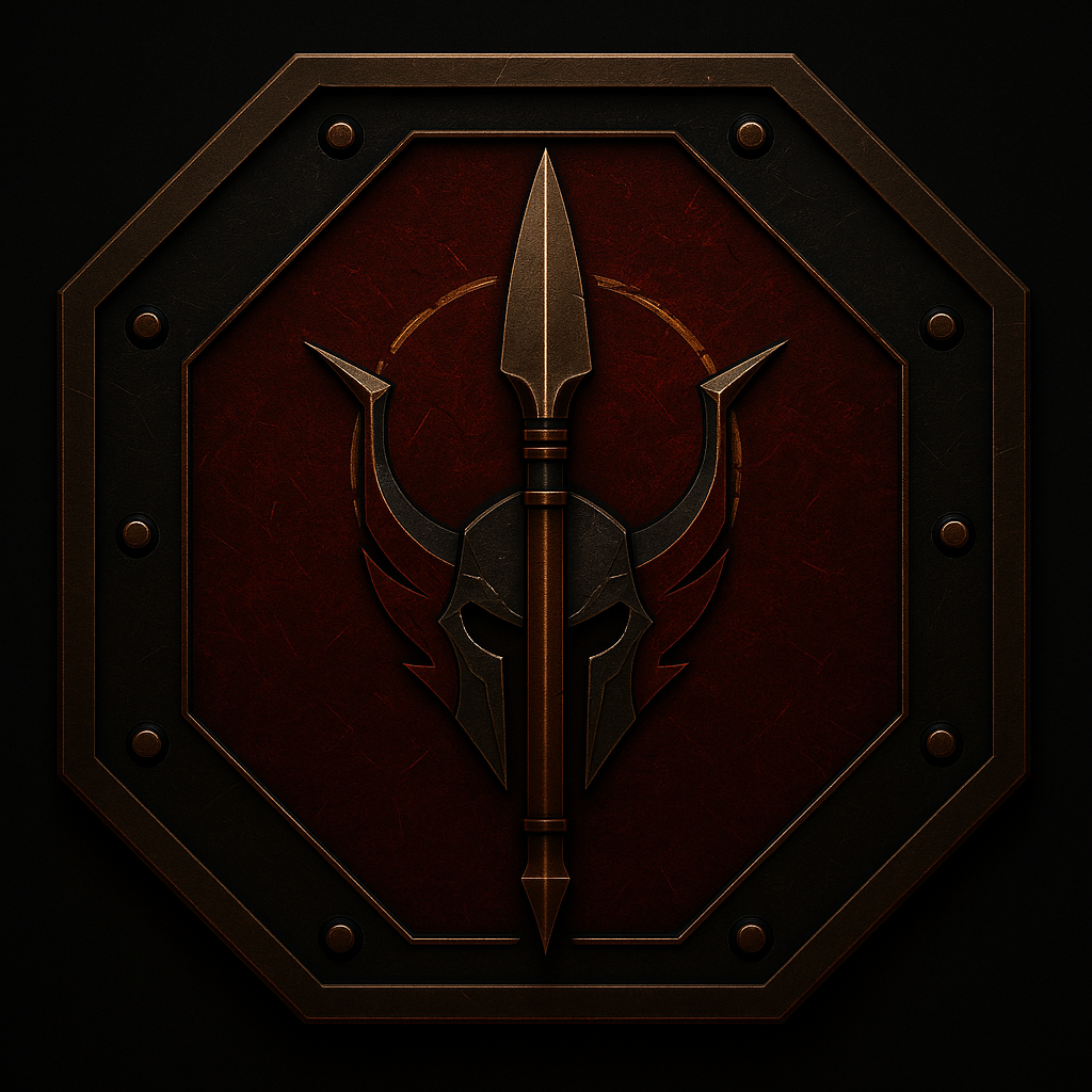 The Doryarch Sanguifer," Blood-Bearing Spear-Lord", is the Warbringers cast in metal: mass harnessed to discipline, momentum constrained by Law. The octagon is the vow to make victories habitable; the eight rim bosses mark the beats by which breaches become boulevards. The upright spear is not a promise of rage but of direction, the line that turns today's hole into tomorrow's street. Bronze declares artisanal warfare, machines and men moving as one engine, while blood red remembers cost without worshipping it. The white edge is the Codex Juris Bellum engraved on every thrust: take only what must be taken, keep the clinics lit, keep the bridges bearing. Where this sigil glows from hull or pauldron, enemies learn that the push will not stop, civilians learn the road will stay open, and the map itself understands it is about to be made simpler, permanently.