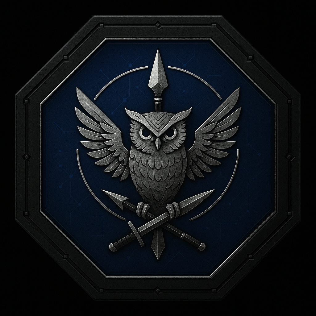 The Glaukopis Nomokrator, "Owl-Eyed Ruler of Law", is Athena's Wardens made of metal: wisdom enthroned, violence obedient. The octagon is Order under the Codex; the royal blue field is the night and network where the Regiment works, turning information into maneuver and silence into victory. The owl is sight that refuses panic and precision that refuses spectacle; its bright eyes pledge that truth will survive audits and enemies alike. The spear signifies open, sovereign force, command given in daylight, while the sword is the shadow blade drawn only to make the minimal lawful cut that ends the war. Silver speaks to discipline and evidence; white to the clean line of Judgment. The eight rim-stones are the Wardens' cadence from decision to disappearance; the broken nimbus vows that the circle will never close around the innocent. Where this sigil glints on hull or pauldron, foes learn their plans will arrive late, their courage alone; civilians learn the lights will stay on; and history learns there will be no legend to rewrite the truth.