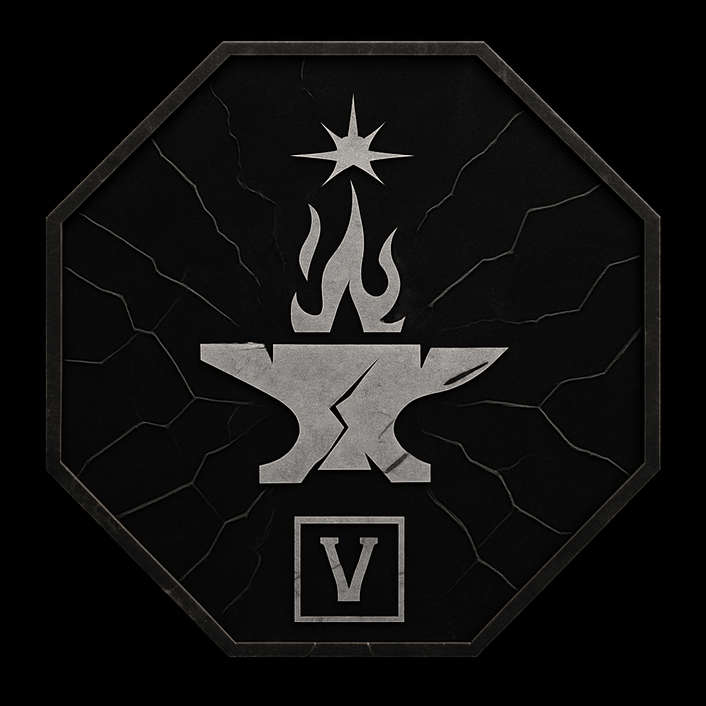 The cultural identity of Section V is one of relentless creation and destruction, embodied by their insignia, the Sigil of the Forge Eternal. This black octagon bears a white, fractured anvil engulfed in angular flames, symbolizing the endless cycle of forging new weapons through fire and sacrifice. The silver fractures coursing through the emblem remind all that progress demands breaking what came before.