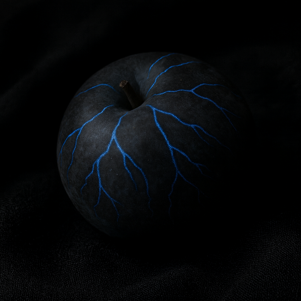 The Frostvein strain was engineered for orbital-winter colonies and high-latitude settlements on frigid worlds. Its trees grow shorter and denser, with heavy, frost-resistant bark and leaves that curl tightly against chemical winds. The fruit's skin is a duskier blue-black, and its bioluminescent veins shimmer in cool white or pale cyan rather than violet, creating a ghost-lantern effect on snowed-in orchards at night. Frostvein flesh runs sweeter and less tannic than the Obsidian baseline, trading some of its astringent "bite" for a mellow, honeyed finish that helps combat palate fatigue in long, cold seasons.