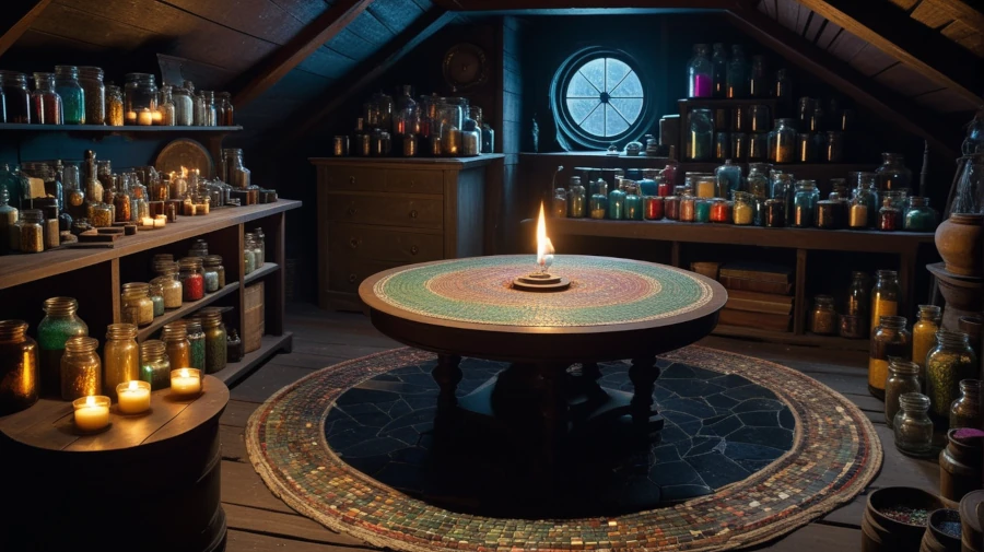 A thick layer of dust and cobwebs covered most everything in the crowded upper room above the shop. Candles flickered on the small, mosaic-top circular table illuminating the raccoon-like vyrian Basr Saklay’n, Senior Historian of Stoverj, the lioness shopkeeper - Li'vary, as Davu had learned - and the Grand Marshall himself. A sweet yet earthy aroma - a painkiller of some sort she’d said - rose in wisps of steam from Davu’s warm mug.