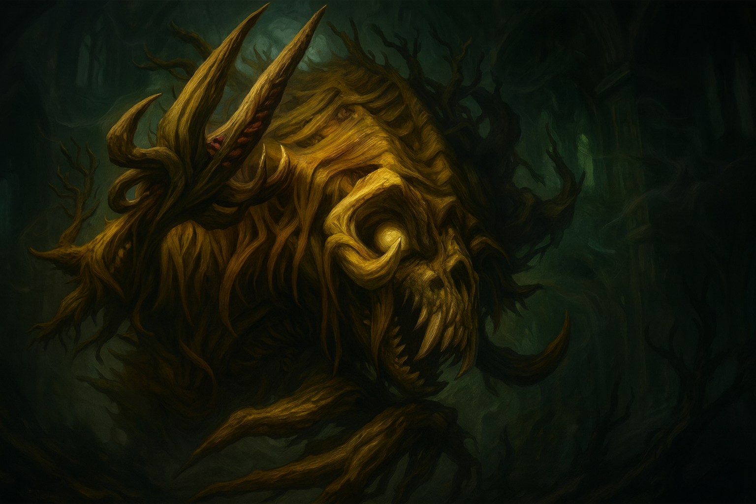 Cyth-V’sug resembles a nightmare of rot and mycelium: a house-sized mass of oozing fungus, swollen tubers, and writhing tentacles. Claws jut from his form at unnatural angles, while a draconic, puff-eyed head rises from the mass. His teeth are jagged, broken spines that drip spores with every breath.Goals and Ambitions