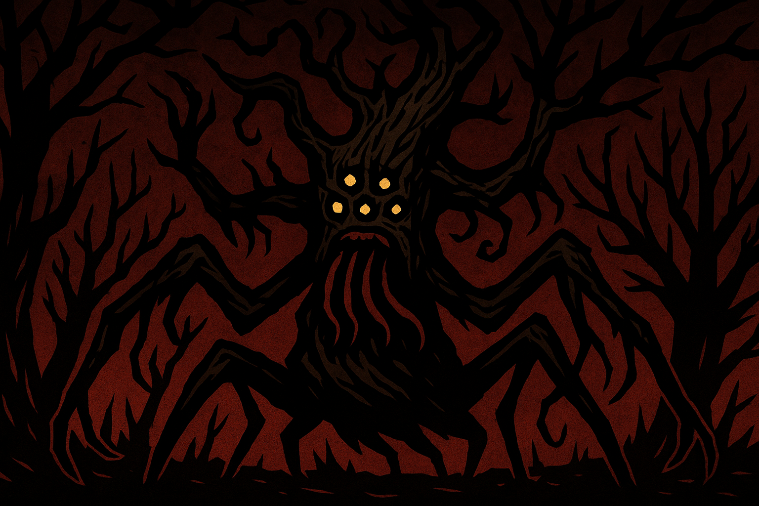 The black square boiled with shadow, and then the Yangethe was there. Its body was a blasphemy of form—tentacles like rooted branches, each studded with eyes that opened and closed without rhythm. Its presence thickened the air.
