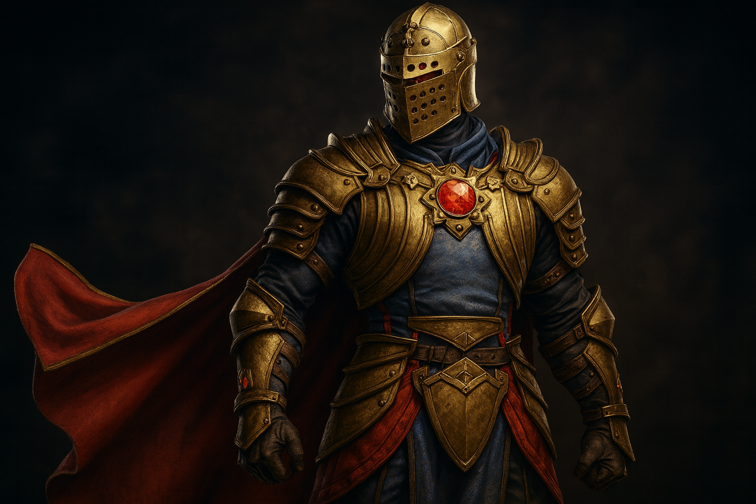 Alduin's initial curiosity became an obsession as he unearthed more about Tynathria. He sought out ancient ruins, arcane tomes, and forgotten leyline nexuses, piecing together the fragmented history of the Dark Queen. His path crossed with members of the Church of the First, who recognized the aura of Tynathria in the armor he bore. Seeing an ally in Alduin, they welcomed him as a chosen of their queen and shared their sacred knowledge. Through the Church, Alduin learned of the Helm of Titan’s Wrath, a piece of the armor thought lost to history. Driven by Tynathria’s whispers and the Church’s guidance, he located the helm through a black-market dealer, acquiring it at great cost. With two pieces of the armor in his possession, Alduin’s connection to Tynathria deepened, manifesting in subtle draconic features—golden scales on his hands, a commanding aura, and a voice that resonated with ancient power.A Turning Point
