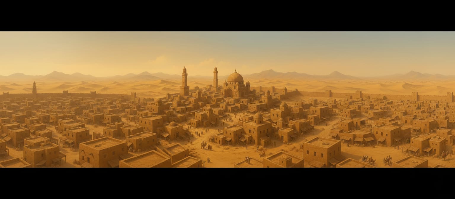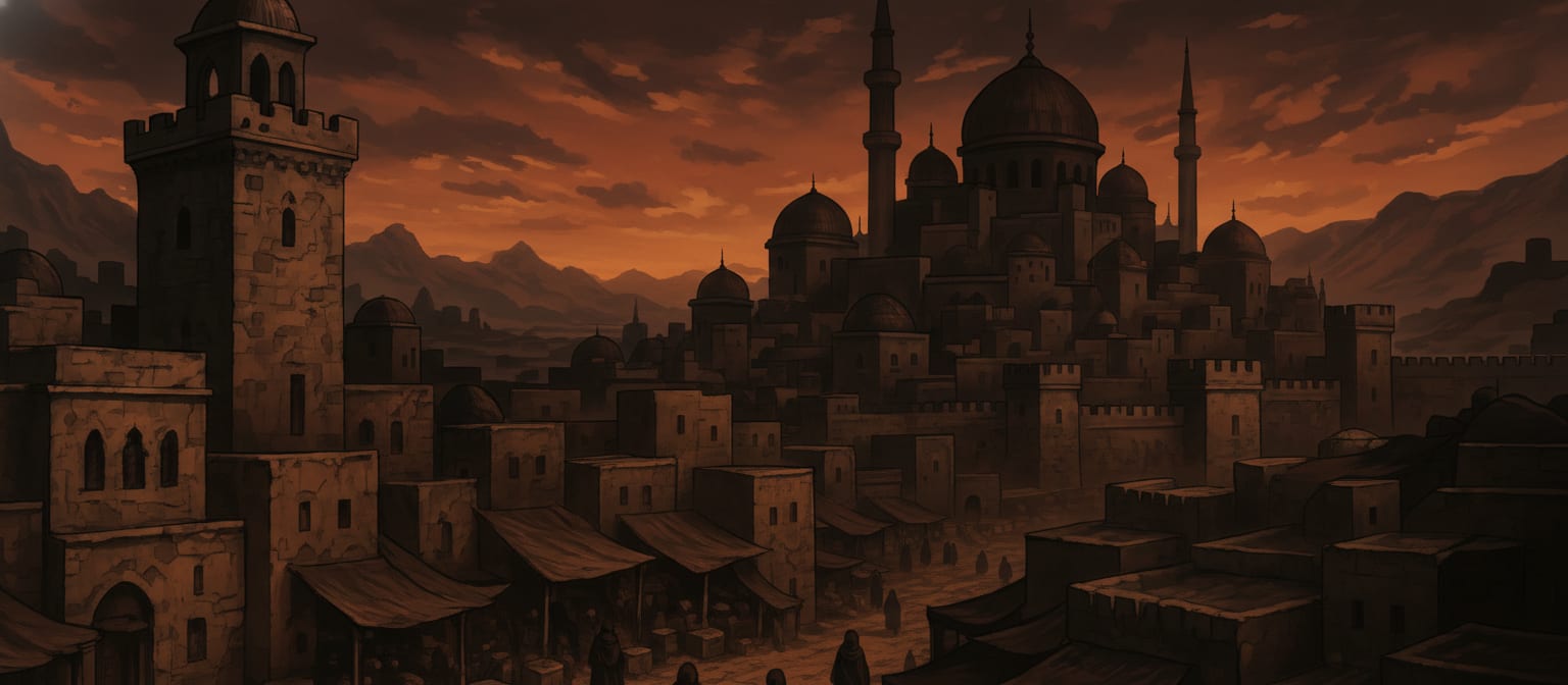 Faujan began as little more than a gathering spot on the desert’s eastern trade run. Long before the city existed, caravans moving between the inner territories and the deep desert followed a narrow arc that curved near an unnaturally barren region to the west. The land there was already lifeless by the time written records begin, but travelers cared less about its origin and more about the fact that its edge provided a reliable landmark and a relatively sheltered place to stop.