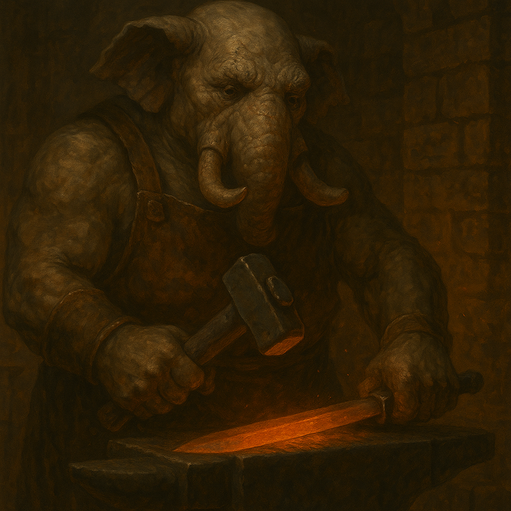 Massive and solemn, his grey hide cracked from years of heat exposure. His tusks are scored with smith-marks that record every blade he’s deemed worthy to exist. He wears an apron made from tanned war banners and carries a hammer named Korr, its head blackened with decades of soot and reverence.