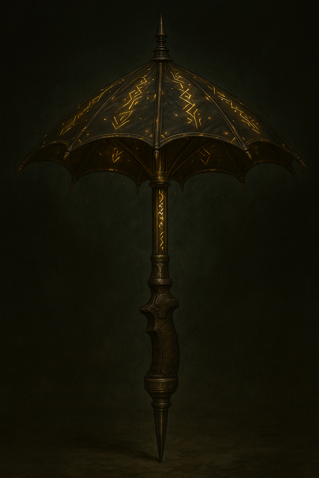 This reinforced umbrella is constructed from Chronorite infused ribs, alchemically waterproof fabric, and an internal arcane focusing chamber. Subtle runes are stitched along the seams and etched into the shaft. When inactive, it functions as a mundane umbrella and walking stick.