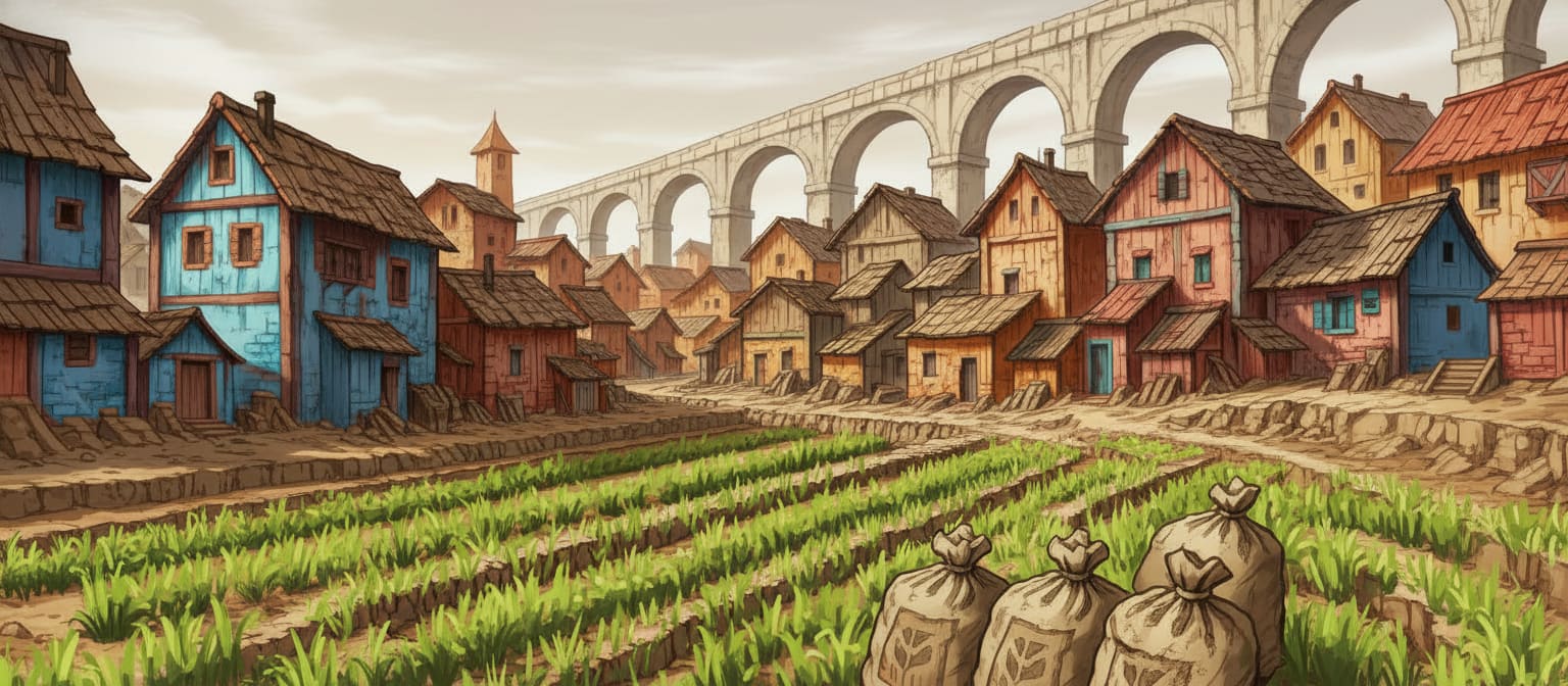 Houses are built from packed clay and stone. Roads are dust-packed and unpaved. Storage barns for fertilizer and harvest goods sit near the town center. Processing sheds for drying, milling, and sorting crops line the inner terraces.
