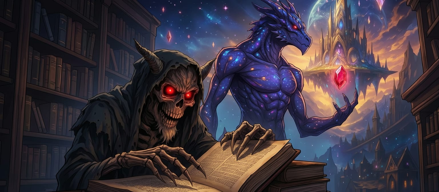 The skeleton offered them a story and a choice. He explained that the world that they lived in was a dream and the original world had been destroyed by undeath. He also explained to them that the gods that they worshipped today were already dead and what they see are merely echoes of their former selves and that the gods were once mortal that were given a task, hence why they have their quirks. Inside of the coffin in the study laid the skeleton of a dragonborn holding a book, Hydall the god of the arcane. Doc took the book and placed it in his satchel while the skeleton continued his story and offered the group their choice: they could choose to be removed from this place, forget the conversation ever happened, and be granted a long life full of happiness and could live out the rest of their years in peace as long as they worshipped the one true god of undeath. The other choice was to decided to continue the pilgrimage, gather the remaining artifacts, and destroy the curse against the goddess of creation which in turn would erase the dream world they were in. During this conversation, Dart was able to sneakily retrieve the book from Doc's satchel and he attempted to leave out of the door as well as teleport, but found that his magic effects merely fizzled out. With the group making the decision to stay and continue their trials, the skeleton exited and left them to their fate of death. Fortunately for them, the coin in Reese's pocket began to glow and get hot to the point of falling and hitting the ground where the god of destruction appeared before them. Because of the choices that they had made, he was able to get in here and was able to grant them a boon, gifting them the ability to dreamwalk and exist in both sides of the world. Unfortunately, all of the boons that they had gained through their experiences up to now would be reduced to nearly nothing and the group exited.