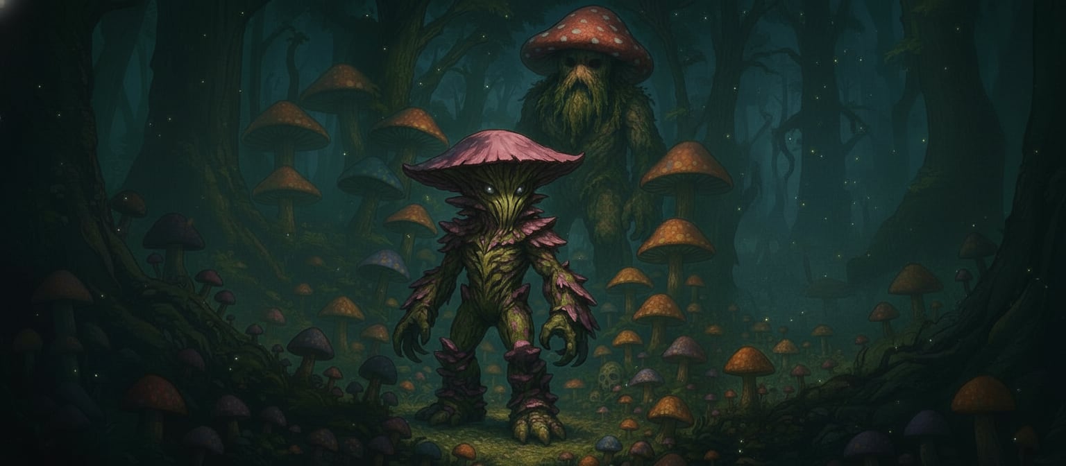 Exiting and walking through the forest now riddled with giant mushrooms, the party comes across a large, mushroom-like creature promptly named the "Shent" or a mushroom Ent. Shroombo gathered the events that had passed through the large gardener's eyes and fixed where bark had grown up around his face. The two took off and went to the large area where the colony was growing and Shroombo thanked Grover for doing his work and asked him to continue to do so. The only real advice that the gentle giant had to give was "Coexistence". The large giant nodded and began making his way off into the distance where the rest of the group began moving towards a small plume of smoke off in the distance. As the party continued on their path, they came upon a swamp where Gomm poked his sword into the water only to find it sticking into the head of an adult black dragon. As they discussed the dragon explained that Grover would send him meals and then use his fecal matter to continue growth and they coexisted together. Slowly sinking back into the swamp, the party attempted to go by but the young dragon leapt forward and attacked. After the battle carried on, the dragon fell and Shroombo was able to help Abnor harvest many parts of it and infuse his body with the scales. Soon after, they came upon a small settlement of goblins.