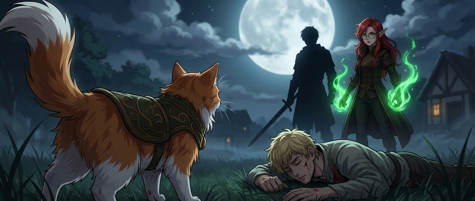 Just then out of the woods, Verrona burst out, covered in blood, dirt, and sweat, nearly breathless from the amount of movement and magic she had to expend to get here and in a last-ditch effort spoke, "I call upon the true name Rum..."...and time seemed to stop. The vested cat stood before her, his hair standing on end, his tail puffy, and his eyes narrowed, exclaiming that should she finish that word he would make her a stain upon the earth. Surveying the area, he requested what she wanted for having summoned him forth like that. Looking towards Dot's lifeless body and not seeing her children she begged for the cat to spare their lives to which his reply was, "The children are a given and he would not see anyone suffer as his own warden of the fey had. The purity and innocence of them would continue living." It was then she begged for the life of her lover, Annghorhast, offering her own in return and the knowledge of the true name of the meowgician to die with her. He accepted this, counter spelling, shattering, and reflecting the spell. While most of it hit her, some of it reflected back against Fenntor's face, and a small fraction repelled into the blade's heart. Seeing his miscalculation, the cat performed one final act as Verrona's lifeless body fell to the ground to ensure that the deal would stand. The "friends" that this old elf had come up in the beginning with would be in his charge, ensuring that the wish and deal of the life given would continue living. Two feminine hands seemingly out of nowhere grasped the children from noose and pulled them into a swirling tear of reality, while the group's own body began to shimmer and crack before pulling them forcefully into a portal. As all line of sight's converged the cat looked back with a sneer, "Ensure that old man survives, I trust you won't make a liar out of me." and he turned back towards the fray before the portal closed.