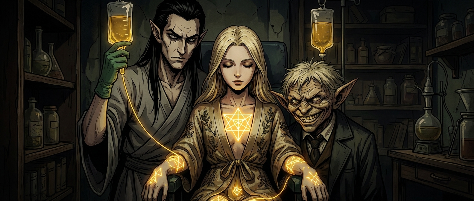 Last we left off, the group still reeling from the events that had transpired at the elven courts found themselves in disarray and exhaustion. Ray wandered into the church across from the hospital and waited to see if he could find Seraphine Virelle, but alas she did not show. He ended up pledging himself to the goddess Bhita Goddess of Art, Commerce, and the Modern World and traded in some of the strength he had previous gained for a different kind of strength, one of divinity. Returning back to the group, they slowly drifted off to sleep. A new day arrived, good news everyone! The blade made it through his surgery and didn't make a liar out of the meowgician; however, the payment for this was steep, but fear not. The good doctor in the great city of Trealing had a plan for them. He had a few tasks for them to perform to pay off the debt with the help of his assistant Pip Blackthumb. The group was first led to a ward on the backside of the hospital where 15 patrons who had run out of money had to be administered a final treatment. Aeren Grimvein realized that this was euthanasia; however, the feeling of loss had kind of numbed him to it and her performed his task with dignity and flair, nearly gaining him a position as a doctor in the great city of healing. Next the group went to an orphanage where they gathered children up to be sent to the good doctor's charity site, where they would be fed, returned to the pinnacle of health, and would eventually be given use to society. It was at this time that one of the people running the orphanage mentioned that they had not seen Seraphine lately. Ghost shifted away to go investigate the clinic where she found a small home built into the back of it and a crackhead rummaging through some of the supplies. Outside of thieves searching for their next score, the house portion did not seem out of sorts. There was no sign of forced entry. There was no sign that she'd even left. It was also during this time that Rheese decided to get violent against pip FOR NO REASON! and punched him twice. Ghost returned to the group and informed Ray, they made their way to the hospital where Rheese decided to stay behind, Pip had a conversation with one of the guards, and the group was off to their next stop, a dance studio and an instructor with a balance not met. Well, a small fight ensued as she tried to escape, and the group was able to remove the leg and take it back to the hospital. During this time, Rheese had a conversation with the blade Annghorhast before being attacked from behind and knocked out. The last stop that the group made was to a few patrons that owed some money, and it went swimmingly. They were able to convince them to pay off their debts and return back to the hospital. What a wonderful day indeed for the great city of Trealing, all items on the list were completed with precision. Pip led them through the winding pathways of the hospital to return them to their comrade before shutting them in a room where the floor opened up underneath them. They slid down and landed in a pit of despair, finding Rheese and one other, a light faith-based man named Torrin who had offered himself as payment to save his son. A creature (shall we say a flesh hydra) erupted from a pile of dirt, bones, and sinew and attacked the group. They dispatched it with the help of Torrin who wielded the blade after Aeren had fallen and moved down the hallway. Each room they opened they saw more and more horrors. Skeletons of children and adults, tortured and left for dead. Within these rooms they found a ring and a wand before coming across a nurse and a pool of bodies in the middle of the room, groaning and crying out for help. Twisted against a tree as if they were being grown or cultivated. Another battle ensued. Ray gathered some medical supplies there and decided to make a syringe cocktail of death. The group continued down, finding that there were eyes strung about rooms and corners of the hallways watching them and made their way to a set of steel double doors. Ray blasted them open and inside they found the doctor and Seraphine who was sleeping in a chair with two Ivs stuck in her arm, one drawing out golden blood and the other returning undivine blood back into her body. Ray saw red and pulled out Noose and both him and Ghost attacked. Rheese ran in and tried to save her, snatching her out of the chair, but the doctor injected him with a serum that paralyzed him and the two crashed to the ground. The power went out and she woke up, exclaiming, "What's going on? You said the power would stay on when you pulled me out!" Ray leapt in the room with noose, attempting to pin the doctor against the wall, but all he accomplished was torching the notes that had been placed on the desk in the corner of the room. Aeren picked Seraphine up and placed her back in the chair and with GREAT PRECISION worthy of the GREAT CITY OF TREALING he hooked her back into the chair where the blood flow started moving again. The doctor turned seeing this and ensured that she was hooked up correctly before Noose Noosed the doctor up, grappling him and ray stabbed him in the neck with the cocktail of death. The doctor wasn't expecting this and the amalgamation of "stuff" that entered his body caused him to begin convulsing and foaming at the mouth. As the lights slowly began to flicker on, Ray saw the light of life fade out of the doctor's eyes.