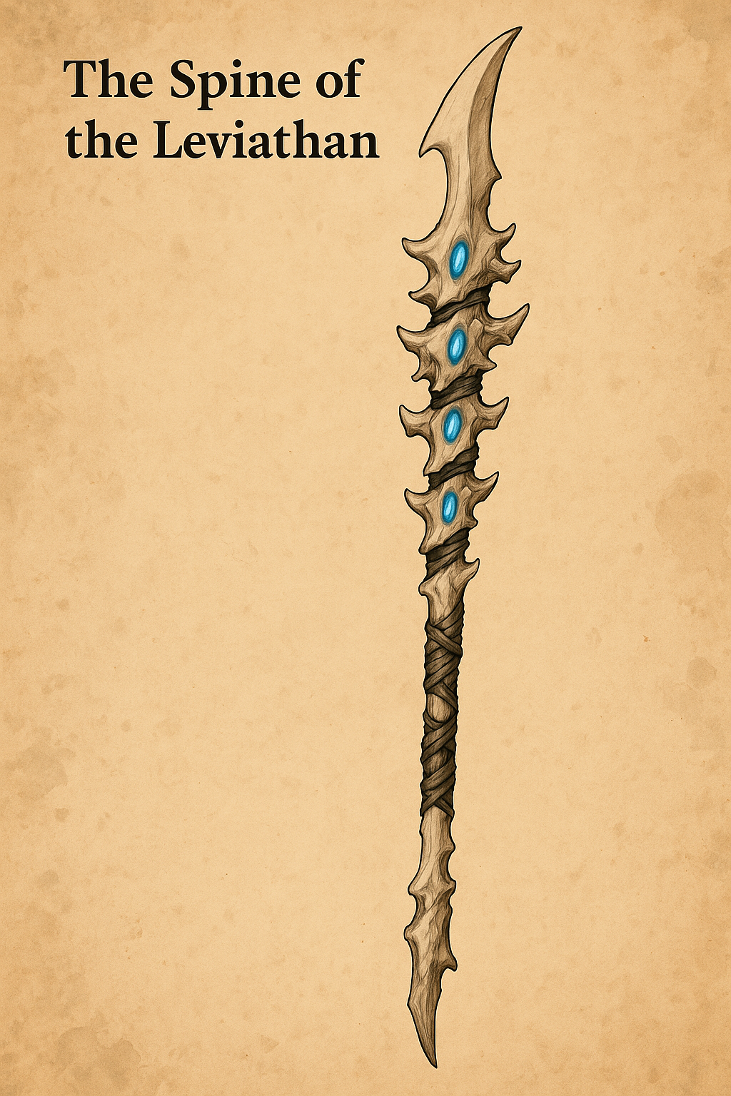 This weapon is made from the vertebrae of the First Leviathan, bleached white from centuries in the crushing depths. Each knotted segment of bone is bound by strips of abyssal sinew, and faint bioluminescent patterns pulse across it like the heartbeat of the deep. When raised, the air grows heavier, as though the ocean itself were pressing down.