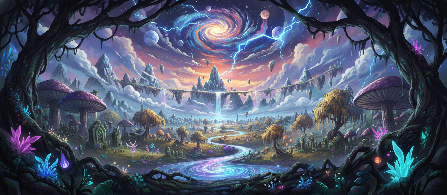The Feywild is an expansive and ever-changing plane of vibrant chaos and is a reflection of the mortal realm shaped by wild magic and emotional resonance. Its terrain is diverse and surreal, with rolling hills blanketed in glowing moss, crystalline mountains that shimmer with internal light, and vast forests of towering trees whose leaves glow softly like lanterns. Rivers of silver and gold snake through the land, their waters imbued with magical properties, while tranquil lakes act as mirrors to the vibrant skies above, which shift between day and night in unpredictable patterns.