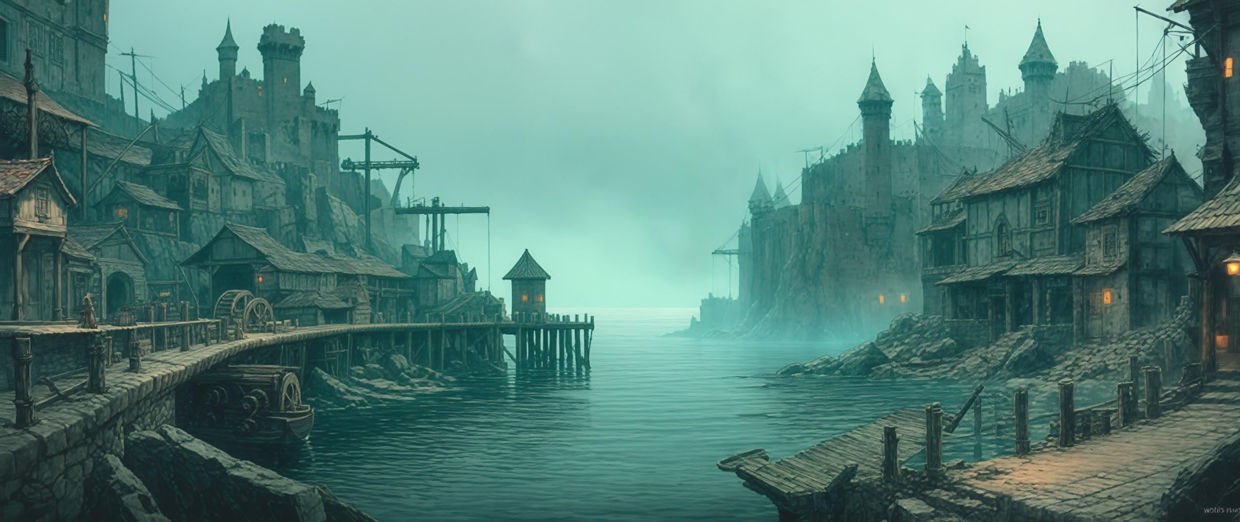 Virifell has aged like an ancient creature—proud but groaning beneath its own weight. Dirt streets, stone piers, and deteriorating bridges connect its districts. The city still maintains functioning aqueducts and water pumps, though many are in disrepair. Small waterwheels and hand-cranked lifts operate in the cliffside regions, while simple wooden cranes load and unload goods at the docks. A basic sewer system exists beneath the original settlement, though it is overrun with rats, fog, and the occasional ghostly presence. Lanterns using phosphorescent sea-moss provide light at night, though fog often smothers them.