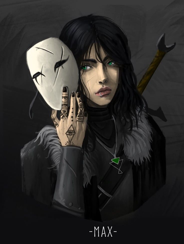 Elzenya, aka 'The Silent Shieldmaiden' wears very tattered, dark colored, typical travelers clothes, with a shiny newer-looking breastplate typically worn on top, along with a a finely carved wooden mask she almost never takes off (hecking fancy party) all of this rests under a very pristine dark cloak that she almost always wears the hood of, keeping a little flower crown on top.