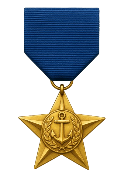The medal depicts a golden star overlaid with a ship’s anchor and coiled rope, framed by stylized waves and crowned by a laurel wreath — signifying victory and the steadfast spirit of those who command the tides. The azure ribbon from which it hangs represents the boundless ocean and the devotion of those who brave its depths in service to the realm.