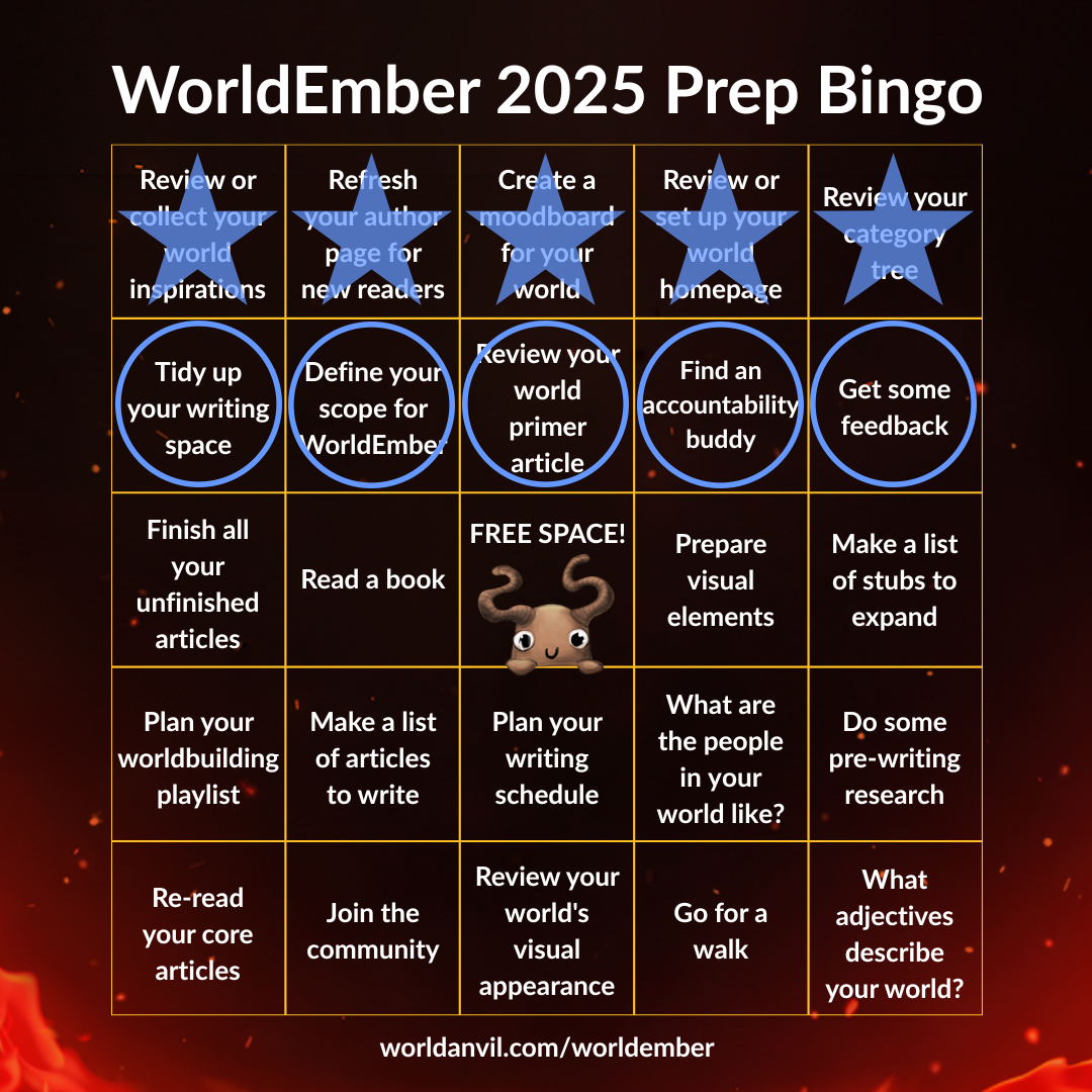 Wow, looking at that, a bunch of it is "soon as WorldEmber starts" stuff for me. I did get some other prep done, that's not on the Bingo Card. I developed a basic draft of world logo, watched the CSS design videos to set the basic design for my world page, painted my first map of the world, and started outlining a short story collection (or possibly a novel, still deciding) set in the world... so there's that, too!